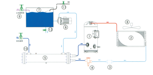1、壓縮機(jī) 2、殼管式冷凝器 3、干燥過(guò)濾器 4、熱力膨脹閥 5、干式蒸發(fā)器 6、不銹鋼水泵 7、水箱
